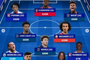 德转列法甲U21最贵阵:杜埃、内维斯领衔巴黎4将,里昂白堡各2人